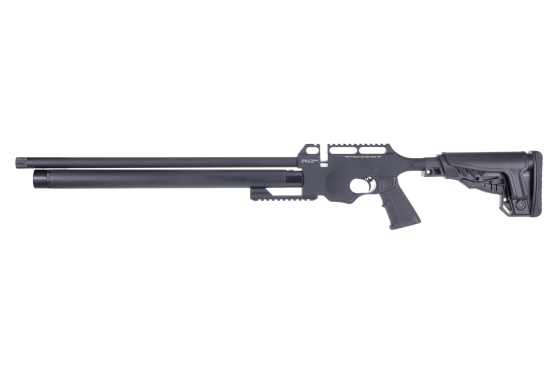 Starke PCP-Luftdruckwaffe mit extern einstellbarem Druckregler, 300-Bar-Karbonkartusche, ummanteltem Lauf mit Gewinde für Schalldämpfer, vollständig aus Aluminium gefertigtem Gehäuse und vollständig einstellbarem Mil Spec Polymer-Schaft.